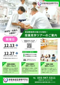 静岡東都医療専門学校では、柔道整復師を目指す方に向けた 授業見学ツアー を開催します。